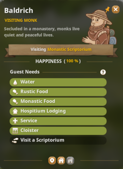 Visitors to the town share many of the same Needs as your own villagers. However some types of visitors have other Needs according to their type and rank. For example, visitors during a Fair might have an Inn Lodging Need, which is satisfied when the visitor is able to find a space in a functioning Inn. High-ranking visitors late in the game, such as the Abbess, might have a Great Hall Need, which is satisfied when she is able to visit the Great Hall. All unique visitor Needs are to do with lodgings (in the Inn, Hospitium, Barracks or Private Quarters according to type) and visiting certain buildings, and are satisfied when the villager is able to find a space in the relevant lodging type or visit the relevant building.